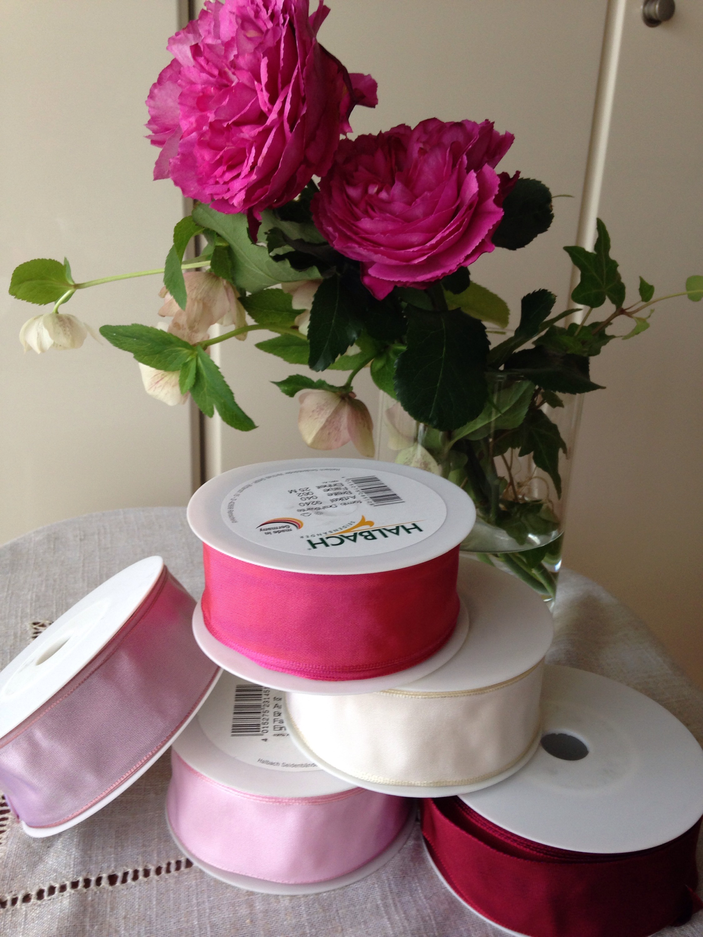 Parisの花市場からやってきた、リボンのお色を選んでもらって、