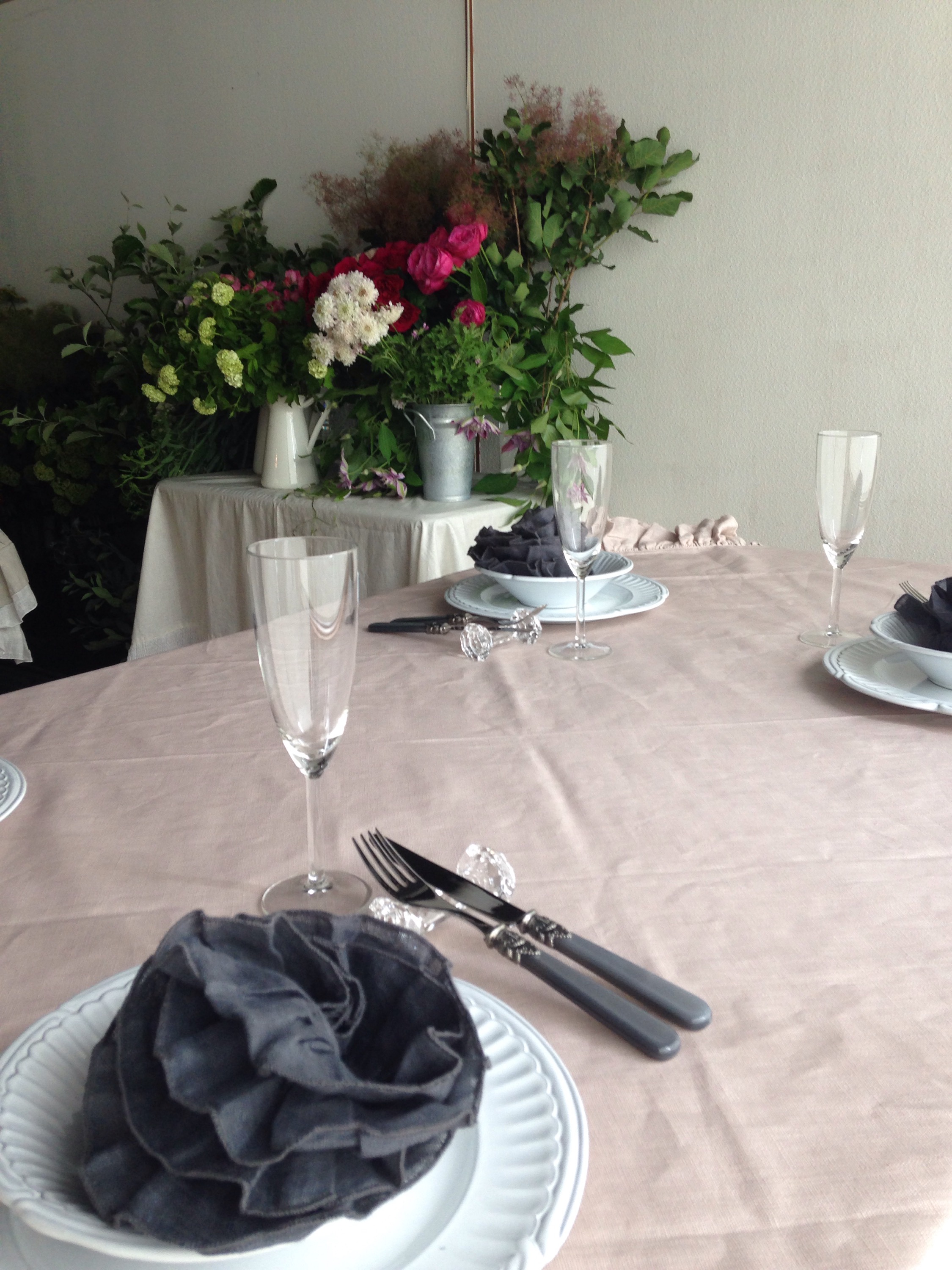 フランスで160年の歴史を数える高級リネンのブランド【アレクサンドルチュルポー】や、イタリアの古都ボローニャのホームリネンカンパニーの【ボルゴ デレ トヴァーリエ】で飾られたテーブルに由美さんがお花をデコレーションされます。
